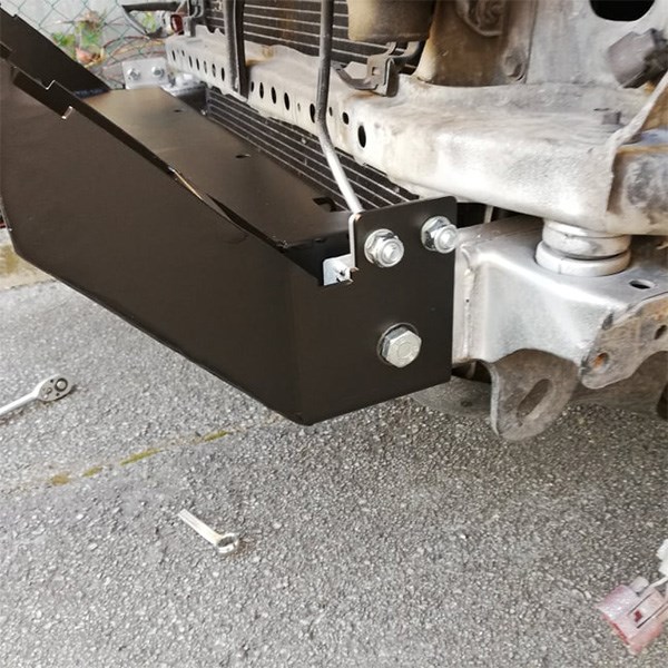 Le pare-chocs est fabriqué en tôle de 4 mm et est peint en noir gaufré. Le pare-chocs est conçu pour l’insertion de 2 pivots (180°) (spécifiques au pare-chocs) et 1 berceau pour le treuil. Le treuil est monté à l’intérieur du pare-chocs et doit avoir une hauteur maximale y compris le levier de déverrouillage de 20 cm.